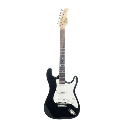 This electric guitar is inspired by the classics of the 50s and 60s. It is handcrafted with attention to the detail and has a traditional double cutaway solid body construction. It is ideal for musicians of any age. Whether you need another Guitar to add to your collection or just need a little something for jam sessions in your garage, this Electric Guitar is for you! It features basswood body and neck, rosewood fingerboard with 22 frets, 3 single coil pick ups, one volume knob and 2 tone knobs. The scale measures 25.5". It also includes a gig bag, an extra set of strings and an amp cord. This is a $30 value, free. The included portable amplifier has a 10 Watt output. It is easy to carry with its special ultra thin design. It has two band EQ and Volume, Base tone, and Treble controls. Buy with confidence as this guitar comes protected with a one year warranty against any manufacturing defects. And at this price you cannot find a better value.
