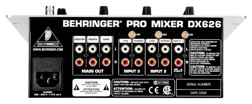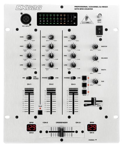 The Behringer DX626 is a professional high-quality 3-channel DJ mixer with integrated Beat-Per-Minute (BPM) counter, and embodies a proven 3-channel design loved by DJs worldwide--beginners and professionals alike. Its super-smooth dual-rail "Ultraglide" crossfader with up to 500,000 life cycles guarantees years of trouble-free fun. Numerous features such as three dual input stereo channels with gain and 3-band kill EQ (-32 dB) and one channel additionally Switchable to studio-grade ULN microphone input and the manual talkover function enable you to work in completely new and imaginative ways. The DX626 is extremely easy to operate and it helps you give free rein to your creativity. Additional features include PFL function with a master/PFL mix option and a peak-hold level meter with a dedicated PFL bar graph. There is also a BNC gooseneck lamp socket.