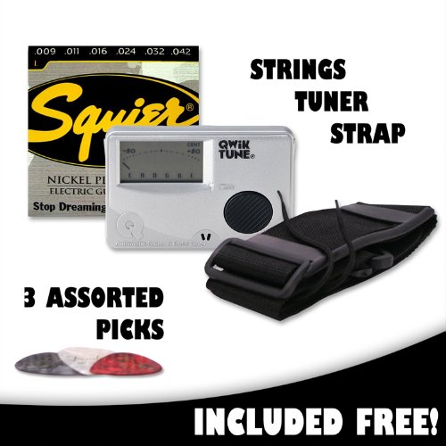 - Includes: guitar cable, strap, stand, chromatic tuner, strings, picks & 8 Watt AMP